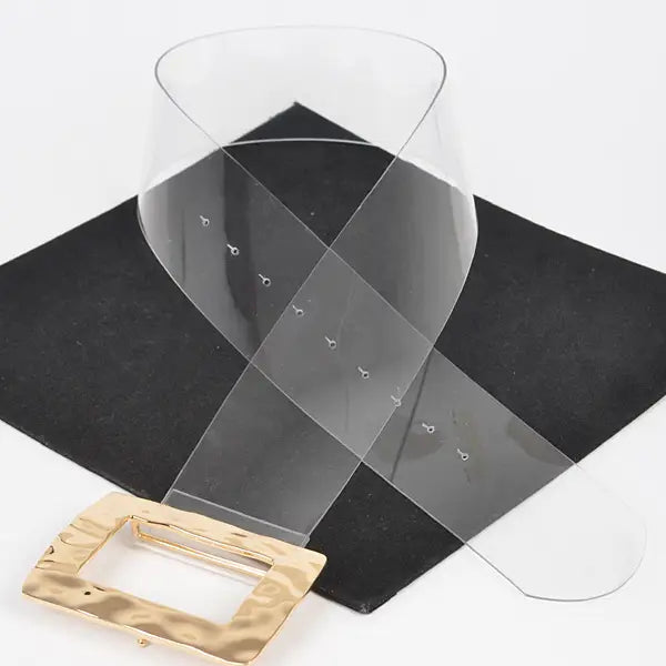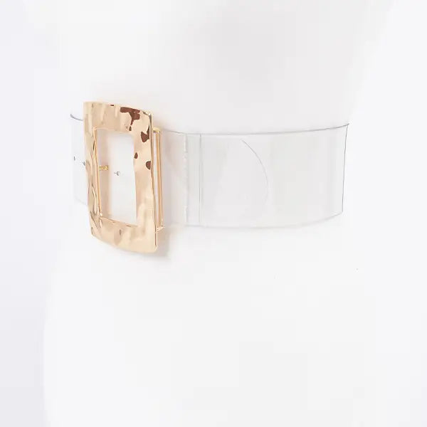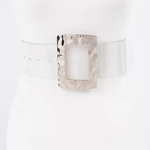 *This clear PVC belt features a rectangular metal buckle and measures approximately 2.75 inches in width and 39.5 inches in length.