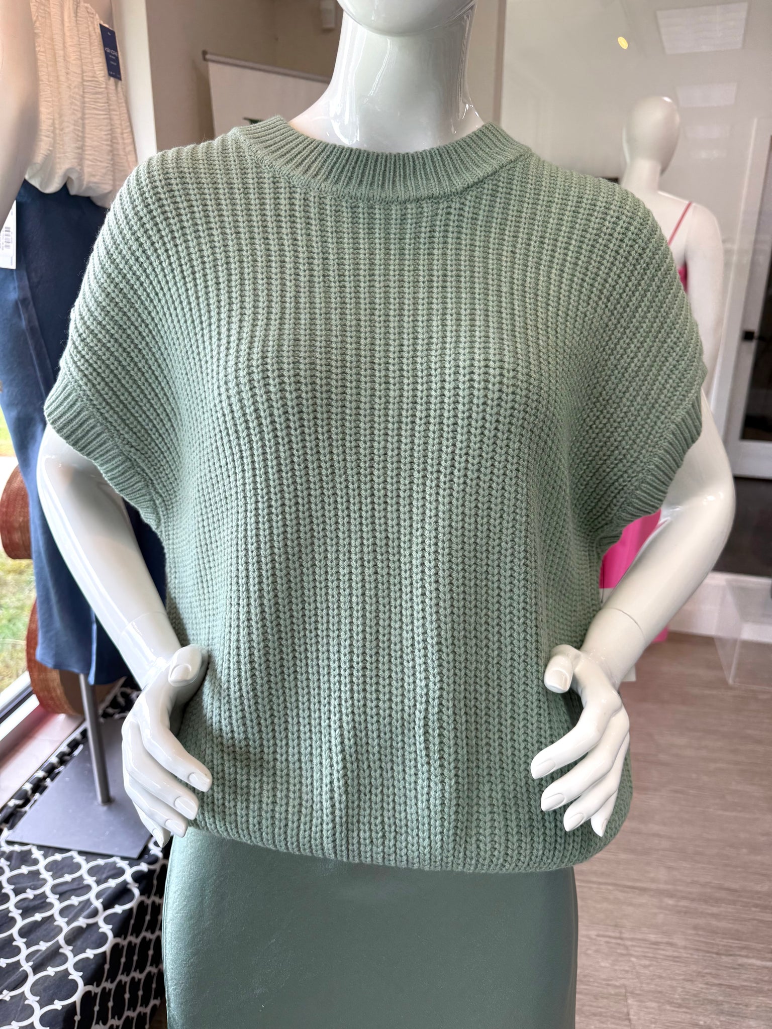 Prepare to wrap yourself in comfort with this expertly crafted sweater vest. Made from soft knit fabric, it showcases a crew neckline and dolman short sleeves for a relaxed fit. The oversized design offers a long, straight silhouette for a modern look, while ribbed details at the neckline, sleeves, and hem provide subtle texture. Composed entirely of acrylic, it ensures easy care and lasting softness.