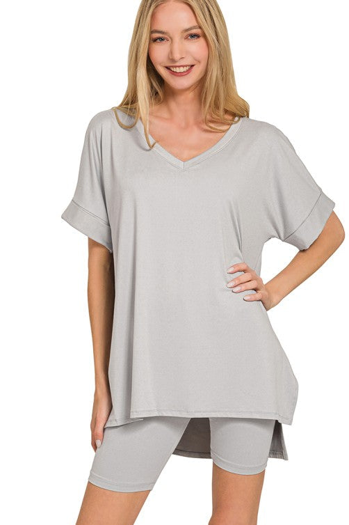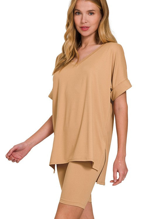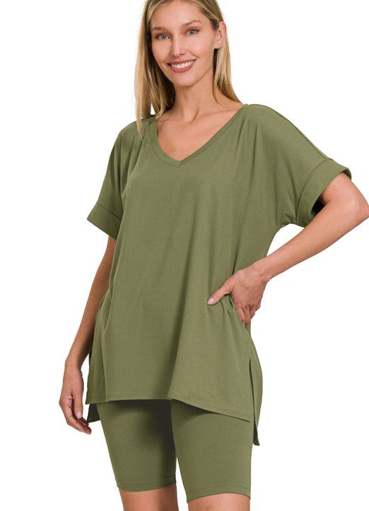 - This set features a brushed DTY microfiber V-neck top with a hi-low hem paired with matching biker shorts. Crafted from 90% polyester and 10% spandex, it offers a luxuriously soft feel along with excellent stretch and recovery for optimal comfort and fit.