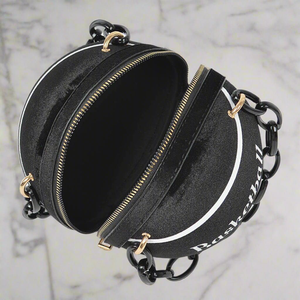 The Velvet Basketball Bag combines luxurious velvet fabric with sturdy mixed metal accents for a unique blend of style and durability. Measuring 6 inches wide, 6 inches high, and 6 inches deep, it offers a compact yet functional size perfect for carrying essentials. The bag features a distinctive plastic chain strap that complements its sleek design while providing comfortable wear. Ideal for both casual outings and statement-making fashion, this bag brings a refined edge to your accessory collection through its expert craftsmanship and attention to detail.