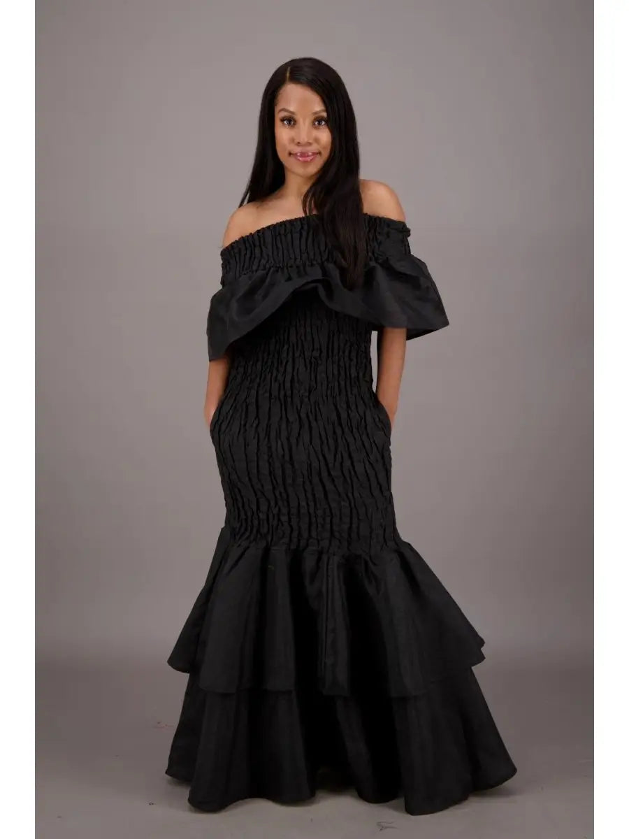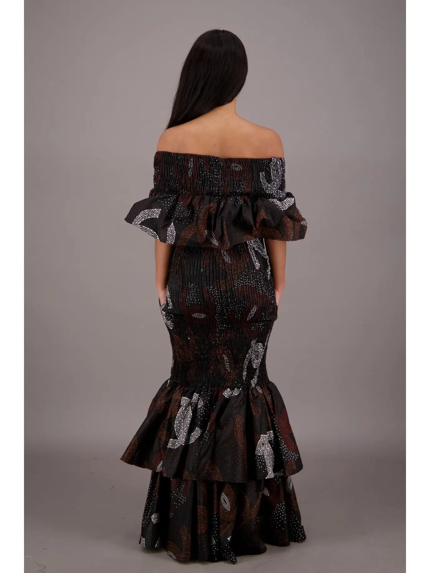 Designed to fit most sizes, this piece is crafted in India from 100% wax print cotton. Its classic and glamorous style makes it ideal for cocktail parties and formal events. For best care, hand wash only.