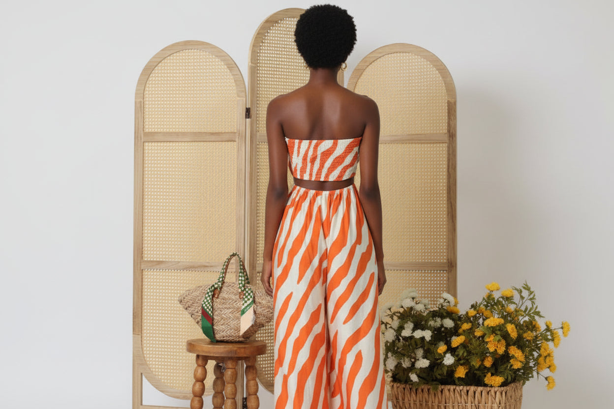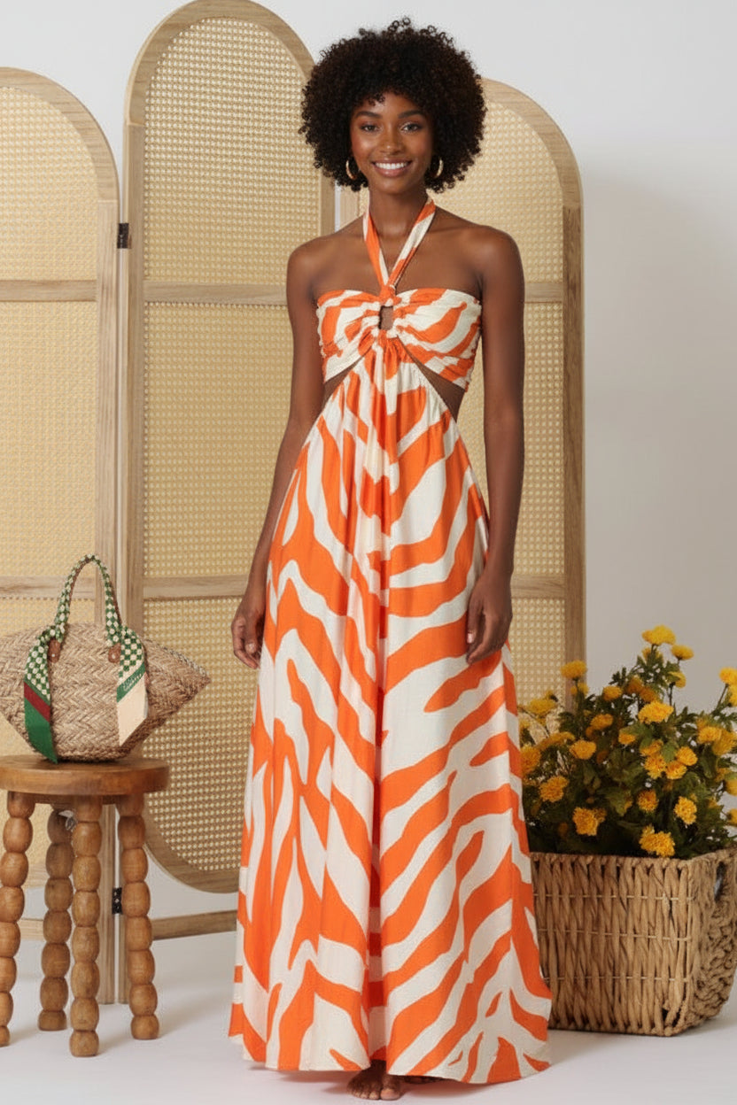 Elegant maxi dress featuring a striking tie-back neckline with cutout detail and a comfortable elastic waist. Perfect for elevated everyday wear or special occasions, this piece combines sophisticated design with effortless comfort.