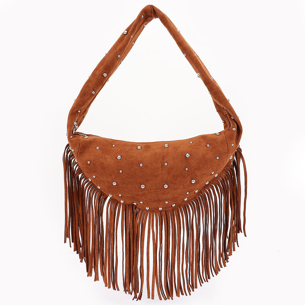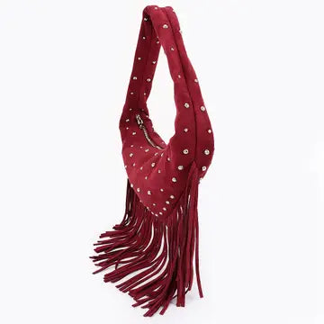 This Riveted Fringe Suede Hobo bag combines style and practicality with its supple polyurethane suede construction and mixed metal accents. Measuring 16 inches wide, 6 inches high, and 4 inches deep, it offers ample space for everyday essentials without feeling bulky. The fringe detailing adds a dynamic, boho-inspired touch, while the riveted hardware ensures durability and a polished finish. Designed for the discerning individual, this accessory balances fashion and function, making it a versatile addition to both casual and sophisticated wardrobes.