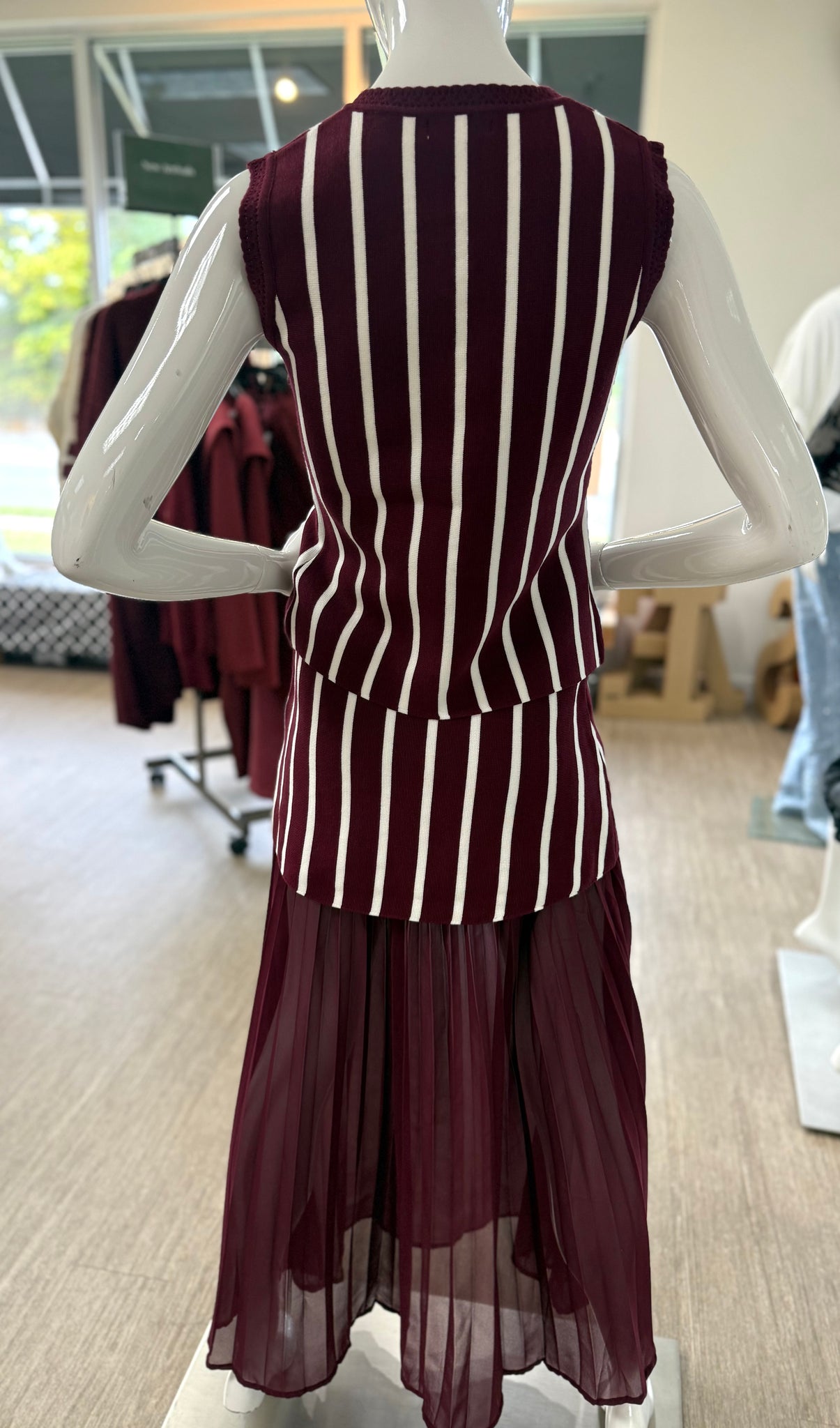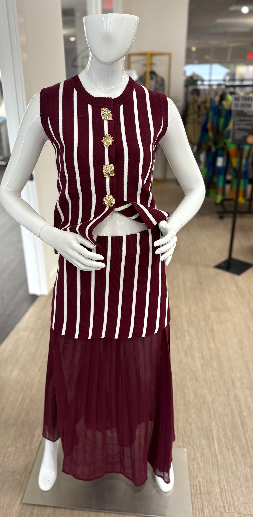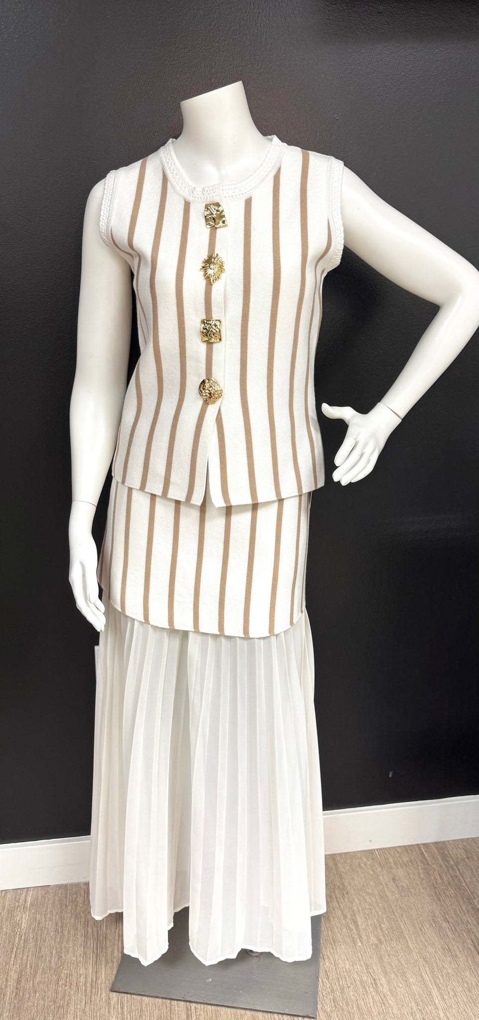 Elevate your wardrobe with the Another Day to Be Glam Set, a sophisticated two-piece ensemble designed for effortless style. This set features a sleeveless vest adorned with decorative gold hardware, adding a refined touch to your outfit. The matching skirt combines a stretchy elastic waistband for comfort with a pleated chiffon finish that flows gracefully. Crafted from a premium blend of 55% viscose, 28% polyamide, and 27% polyester, the fabric offers durability, stretch, and a flattering silhouette. Perfect for both day and evening occasions, this versatile set ensures you stay polished and glamorous.