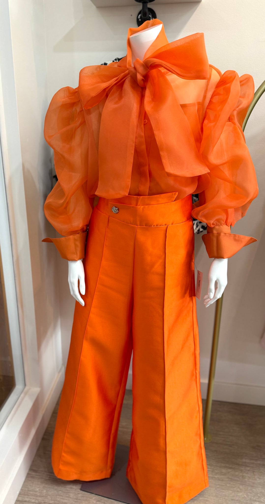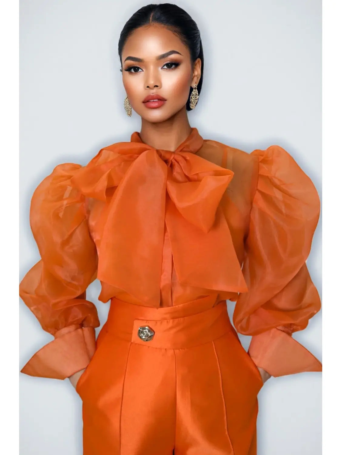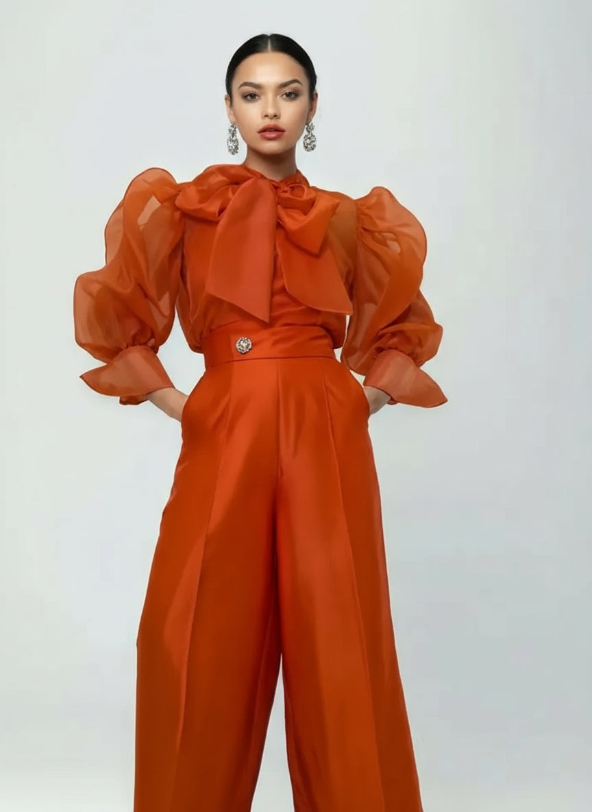 Elevate your wardrobe with this sophisticated two-piece ensemble designed for the modern professional. The sheer blouse showcases expertly crafted long puffed sleeves with extended cuffs that frame the arms beautifully, while the button-down front and elegant tie-neck detail add refined structure. A coordinating camisole is included, providing seamless layering and ensuring versatile styling options from the boardroom to evening events. Paired with impeccably tailored wide-leg palazzo pants, this set delivers both polish and comfort. The pants feature a flattering high waistband that defines the silhouette, a functional front zipper with button closure for secure fastening, and thoughtfully placed pockets—a practical detail often overlooked in contemporary fashion. The flowing wide-leg cut creates an elongating effect while allowing freedom of movement, making this ensemble ideal for all-day wear without compromising on elegance or functionality.