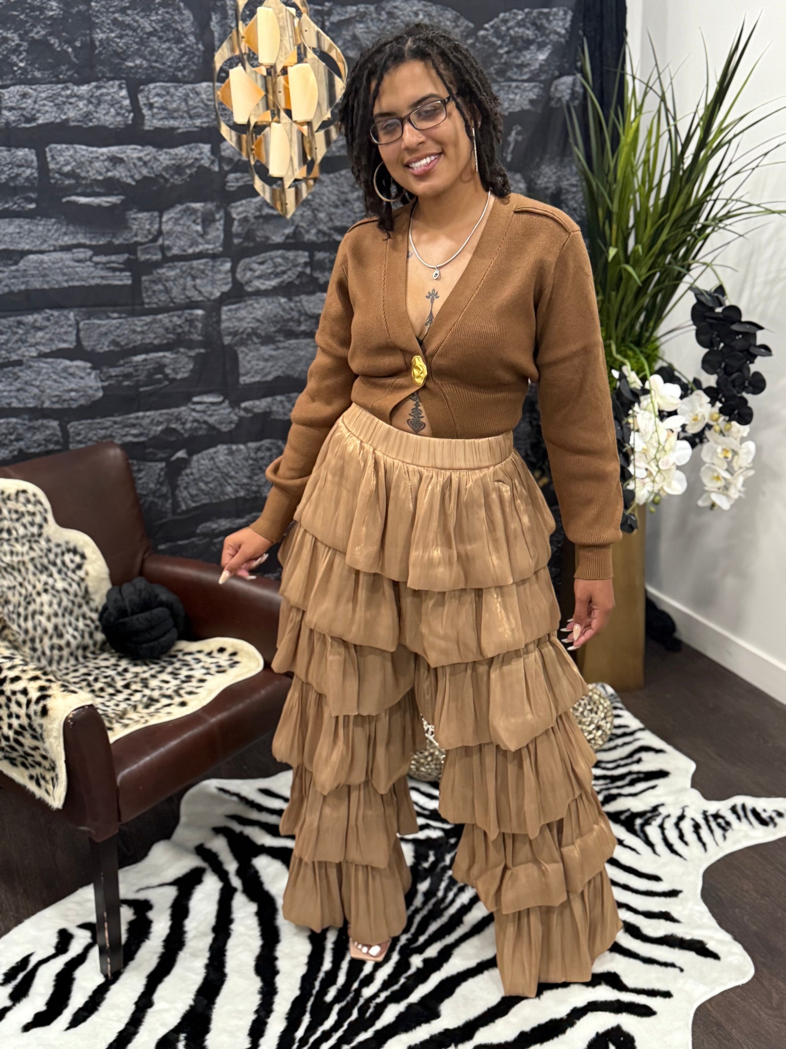 The Highly Anticipated Cardigan features a deep V-neckline enhanced by a refined ribbed knit texture, creating an elegant and timeless appeal. A striking gold decorative button at the front adds a touch of sophistication and elevates the design. The fitted waistline is tailored to accentuate your silhouette, offering a flattering and polished look. Slightly puffed sleeves with ribbed cuffs provide a subtle volume and structure, balancing comfort with style. This versatile piece effortlessly transitions from professional environments to casual outings, making it an essential addition to any wardrobe seeking both classic charm and modern functionality.