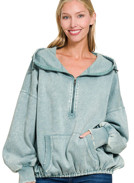 This acid-wash fleece kangaroo hoodie features a half-zip design with a washed drawstring hem and a spacious kangaroo pocket. Crafted from a 60% polyester and 40% cotton blend, it offers a relaxed fit with approximate measurements of 24.5" front length and 52" chest width (small size). Note that color may slightly vary due to monitor settings.