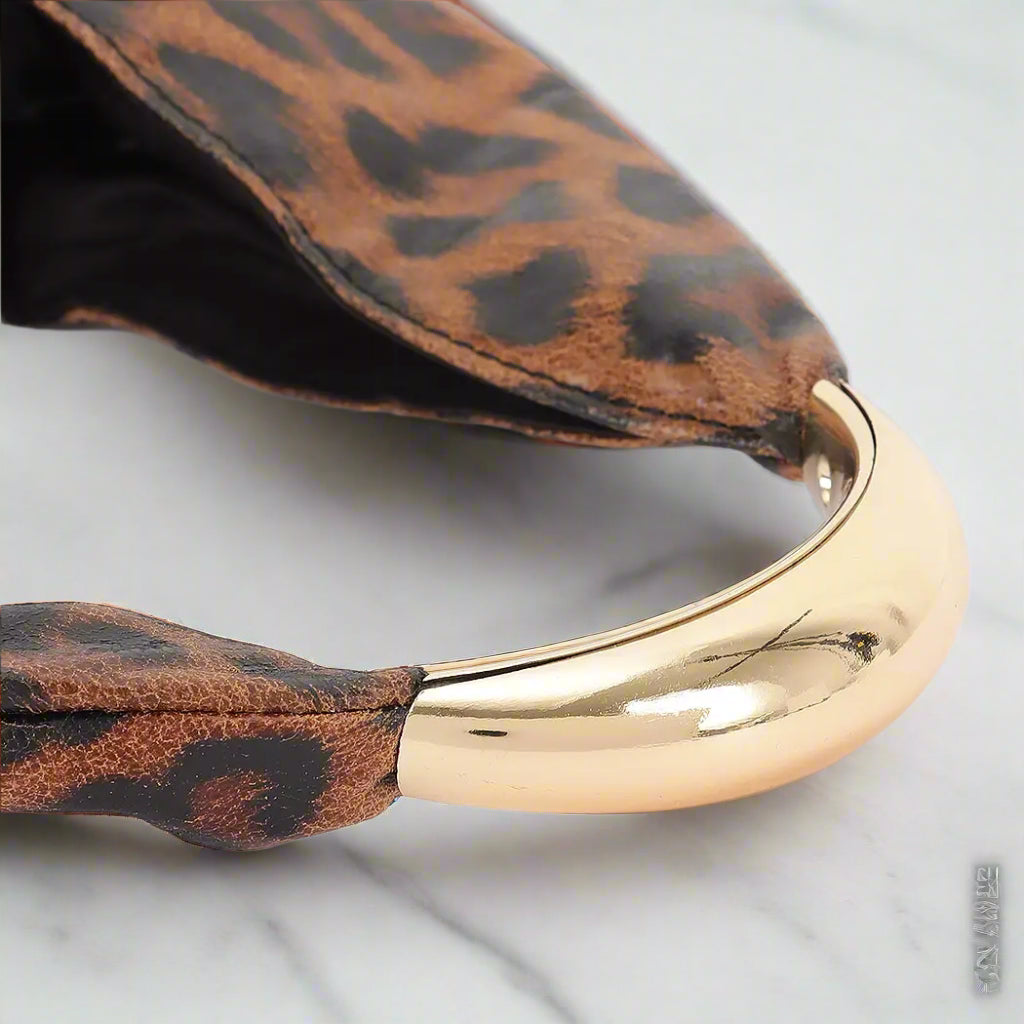 * This Leopard Print Faux Leather Hobo Bag measures 14" wide, 16" high, and 1" deep, crafted from polyurethane with mixed metal accents. It offers a roomy hobo silhouette adorned with a bold leopard print and a metallic top handle, combining practicality with a fashionable edge ideal for elevating everyday ensembles.