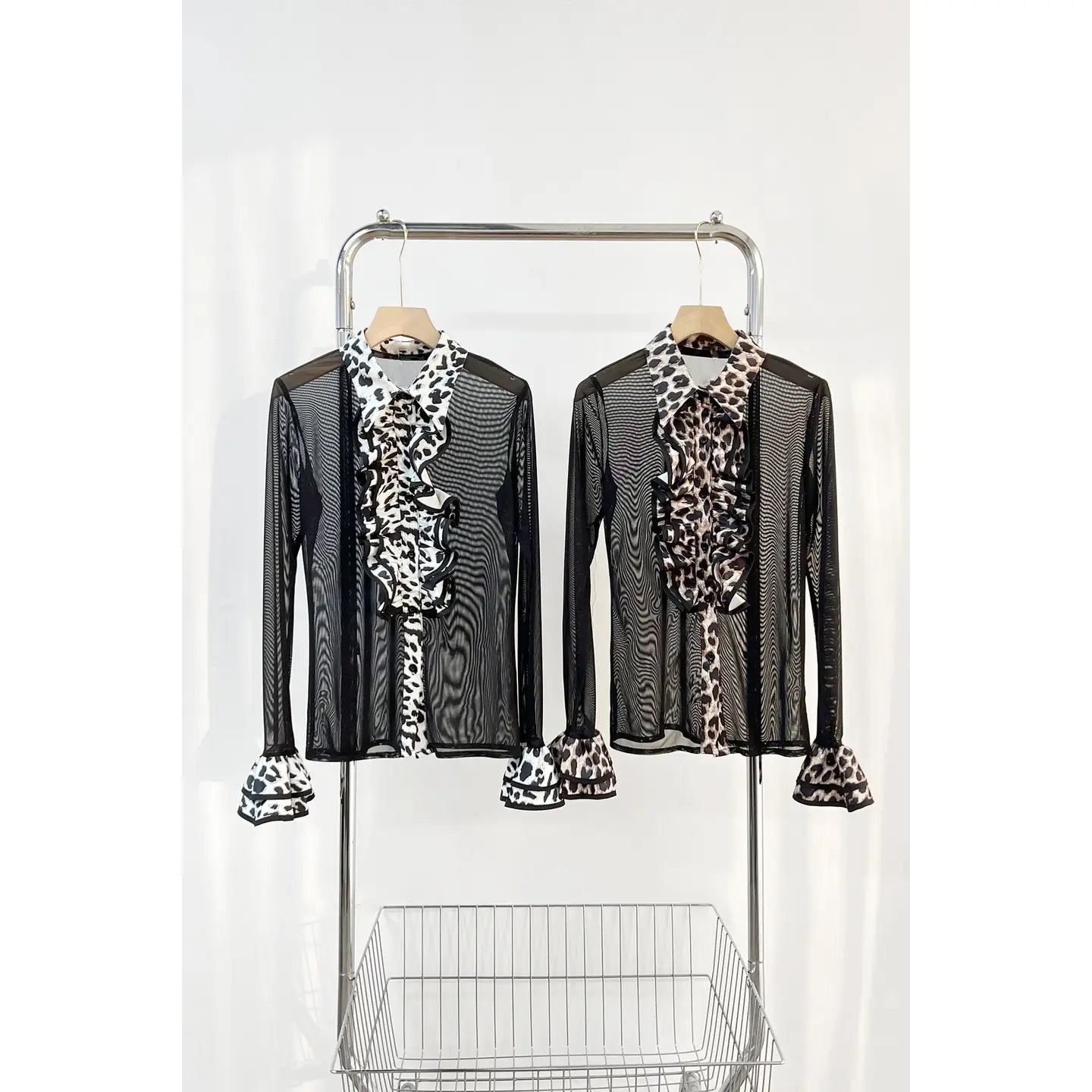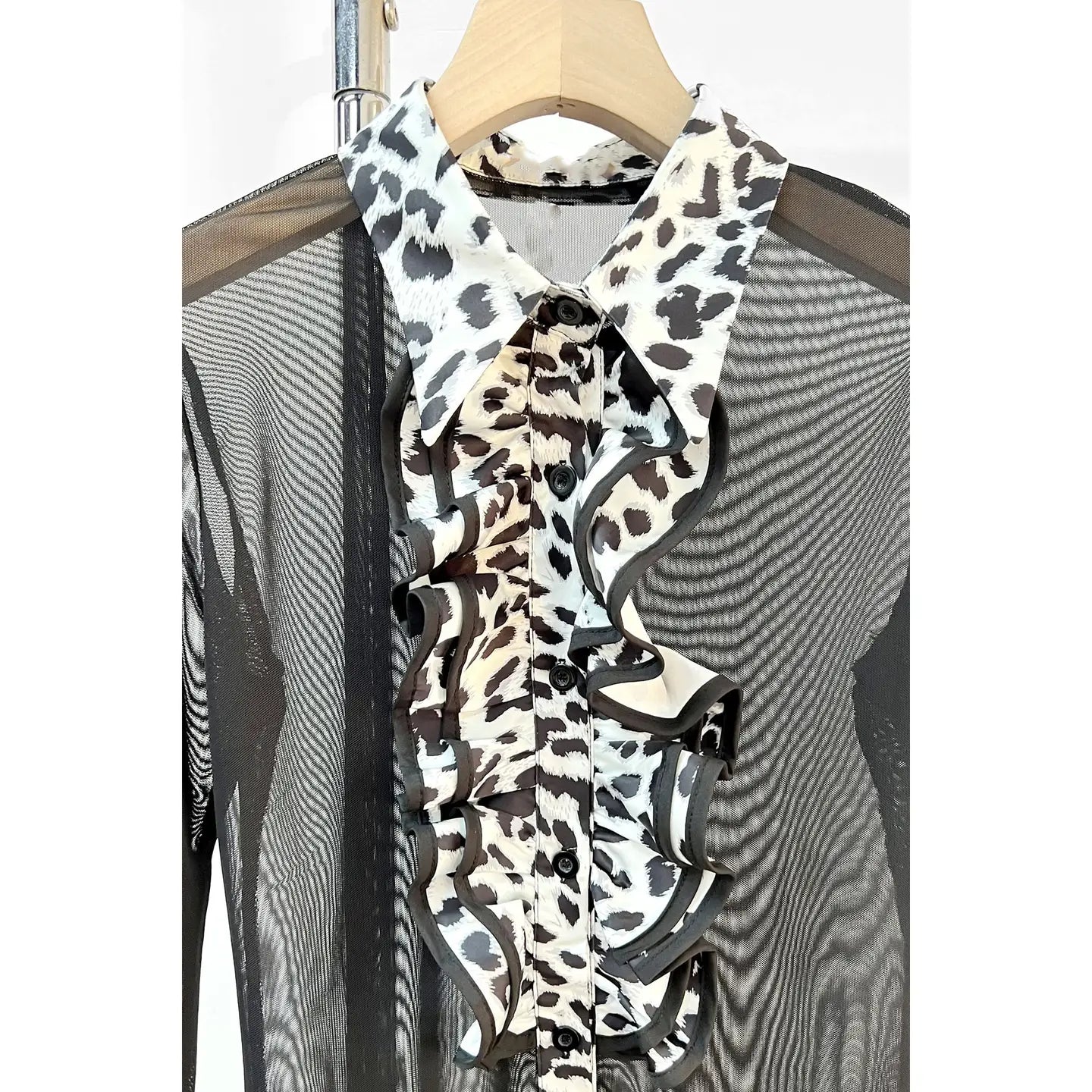 Elevate your wardrobe with the Midnight Safari top, featuring a sheer fabric adorned with a sophisticated animal print that captures a wild yet refined aesthetic. The long sleeves provide coverage while maintaining a delicate, airy feel, perfect for transitioning between seasons. Its standout ruffle collar adds a touch of elegance and dimension, framing the neckline with subtle movement. This versatile piece balances bold style with wearable comfort, ideal for layering or wearing solo to make a statement in any setting. The Midnight Safari top is designed for those who appreciate fashion-forward details with a polished finish.