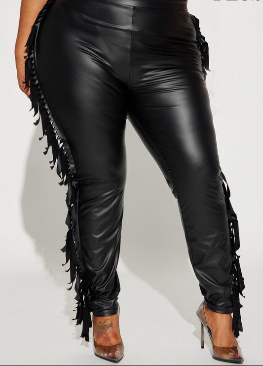 Crafted from 100% polyester, these Ride Away Pants combine the sleek look of faux leather with dynamic side fringe accents. Designed to offer both style and comfort, they provide a flexible fit suitable for various occasions. The fringe detailing adds movement and a distinctive edge, making them a standout piece for those seeking a fashionable yet versatile addition to their wardrobe.
